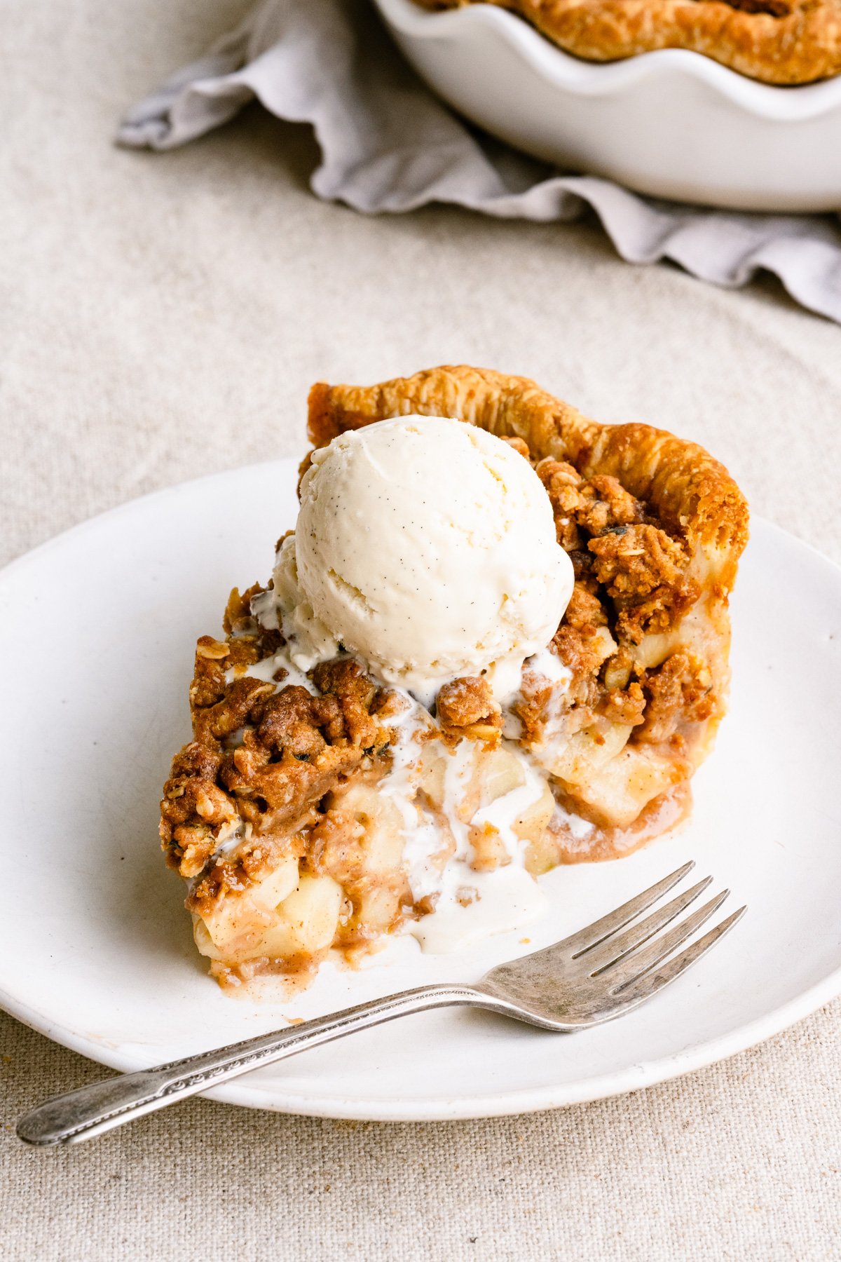 Caramel Sauce 6 Make homemade caramel sauce ahead so it has time to cool. If you're using it cold straight from the fridge, warm slightly into a pourable consistency before adding to the pie. Homemade Pie Crust 1 Make the pie crust dough according to the recipe ahead of time. I like to make the double pie crust for this recipe, so I have plenty of overhang and a thicker crust. 2 Roll the dough out to 1/4-inch thickness and line the pie pan. Trim away any overhanging dough, leaving about 1-inch overhang. Fold the overhanging dough under itself, to where it stays inside the edge of the pan. Crimp the dough and then dock the sides and bottom all over with a fork. 3 I don't always egg wash the crimp on this one, but if you'd like, just beat an egg and 1 teaspoon cream with a fork. Brush lightly over the crimped edges. 4 Place the lined pie pan in the fridge for the dough to firm while you make the filling and crumble. Oat Crumble Topping 8 Whisk together the flour, oats, sugar, spices, salt, and sage in a large bowl. 9 Drop in the cold butter cubes and work them into the dry mixture with your hands until well combined and chunky. Place the bowl in the fridge to keep the crumble cold until ready to assemble the pie. Pre-Cook Apple Pie Filling 16 **Pre-cooking the granny smith apples for a just a few minutes, creates a softer apple filling with thick slices that are neither too hard or mushy. This step also makes filling the pie crust easier, since the apples are a little softer and can be layered more evenly. They have also shrunk some in the pre-cooking process, giving a more realistic idea of how much filling can be added. 11 In a small bowl, whisk together the flour, sugar, spices, and salt. 13 In a large wide bottom pot or skillet on medium-low heat the butter until melted, add in the apples and lemon juice. Stir to coat. Sprinkle the sugar mixture on top and gently fold the apples with a silicone spatula to distribute. 12 Continue gently folding the apples while they cook and soften for about 5-6 minutes. Cook just long enough that they shrink slightly and become a little soft. 14 Remove from heat and let the apples cool to room temperature. I transfer mine to a large wide bowl to cool more quickly. Assemble and Bake 21 Preheat oven to 400℉ (200℃). Place an oven rack in the lower third of the oven. Set out a rimmed baking sheet. 17 Remove cold pie crust from the fridge and layer in the cooled apple slices. Scrape any excess liquid into the pie pan. 18 The apples should fill up slightly higher than the sides of the pan as they will still shrink some in the oven. 19 Drizzle in the caramel sauce between layers to fill the cracks. It's ok if some pools up on top of the apples, it will melt down into the cracks in the oven. 20 Take the cold crumble from the fridge and break into small chunks. Layer across the apples, gently pressing down to pack it down slightly. 22 Place the pie dish on the rimmed baking sheet. The pan will catch any drippings that might bubble out and help to heat the bottom of the pie crust. 23 Bake the pie for 20 minutes to kick start the pie crust, helping it cook through. 24 Reduce heat to 350℉ (180℃) and continue baking for another 55-60 minutes. The pie is done when the filling is bubbling around the outer third of the pie and through the crumble. 25 If the crumble is getting too dark, gently tent with a loose sheet of aluminum foil . 26 Place pie dish directly onto wire rack to cool completely, about 3 hours. The filling needs time to set and a hot pie will not be easy to cut. 30 Serve plain or with vanilla ice cream and an extra drizzle of caramel sauce.View original recipe